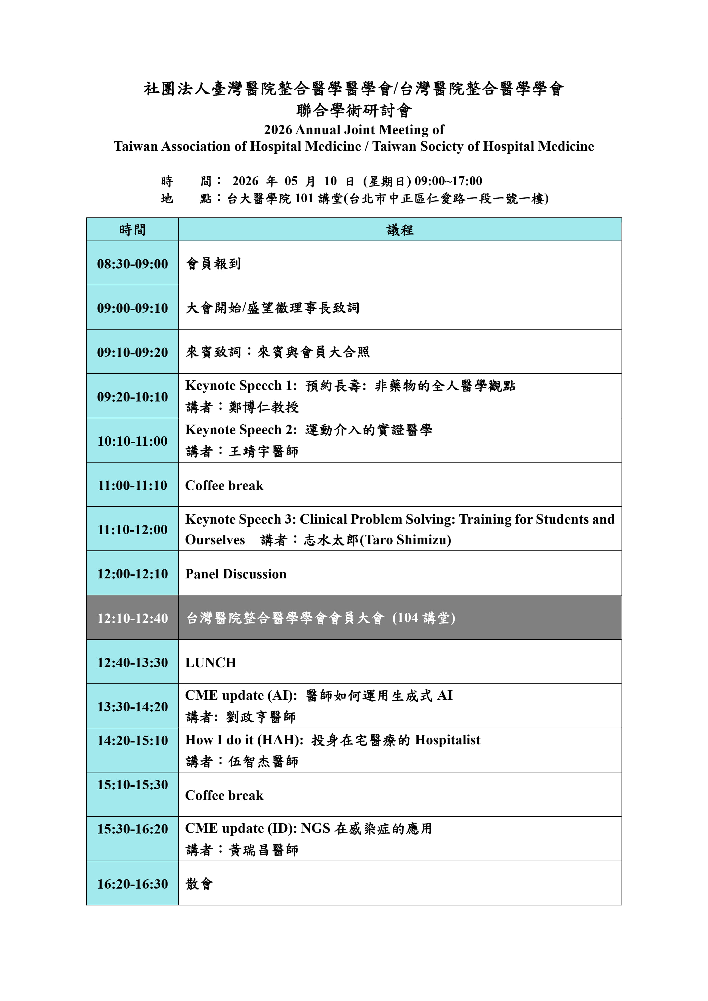 2026本會年會預計於5月10日於台大醫學院101 講堂舉辦