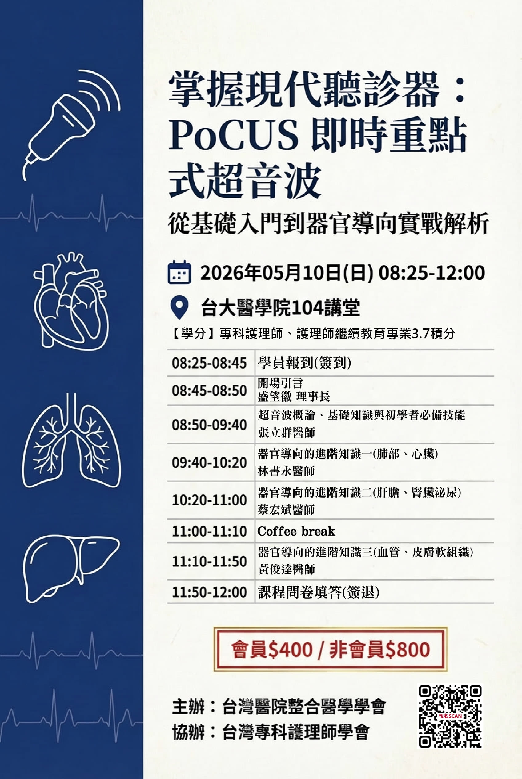 在瞬息萬變的臨床環境中,即時重點式超音波(PoCUS)已躍升為醫療人員不可或缺的「現代聽診器」。本課程由專業醫師陣容親自授課:從「超音波基礎知識與初學者必備技能」無痛入門,建構穩紮穩打的操作邏輯;接著深入三大器官導向的進階實戰解析,全面涵蓋「肺部與心臟」的胸腔重症評估、「肝膽與腎臟泌尿」的腹部掃描,以及「血管與皮膚軟組織」的實用探查。本課程將助您快速將超音波知識轉化為臨床上的得力助手!