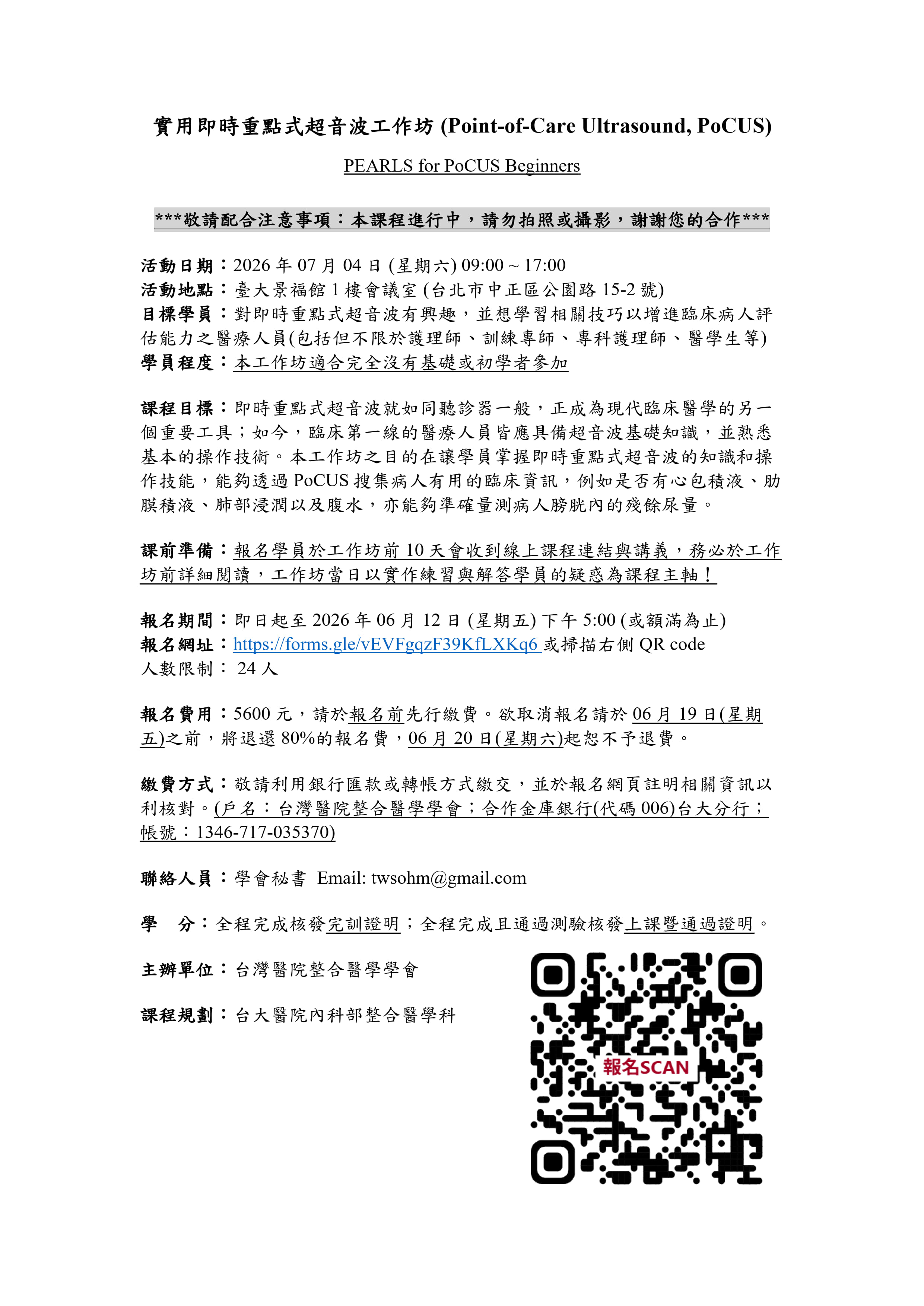 【報名與繳費】 報名連結:https://forms.gle/vEVFgqzF39KfLXKq6 截止日期:即日起至(額滿提前截止) 繳費銀行:合作金庫 (006) 台大分行 帳號:1346-717-035370 戶名:台灣醫院整合醫學學會
