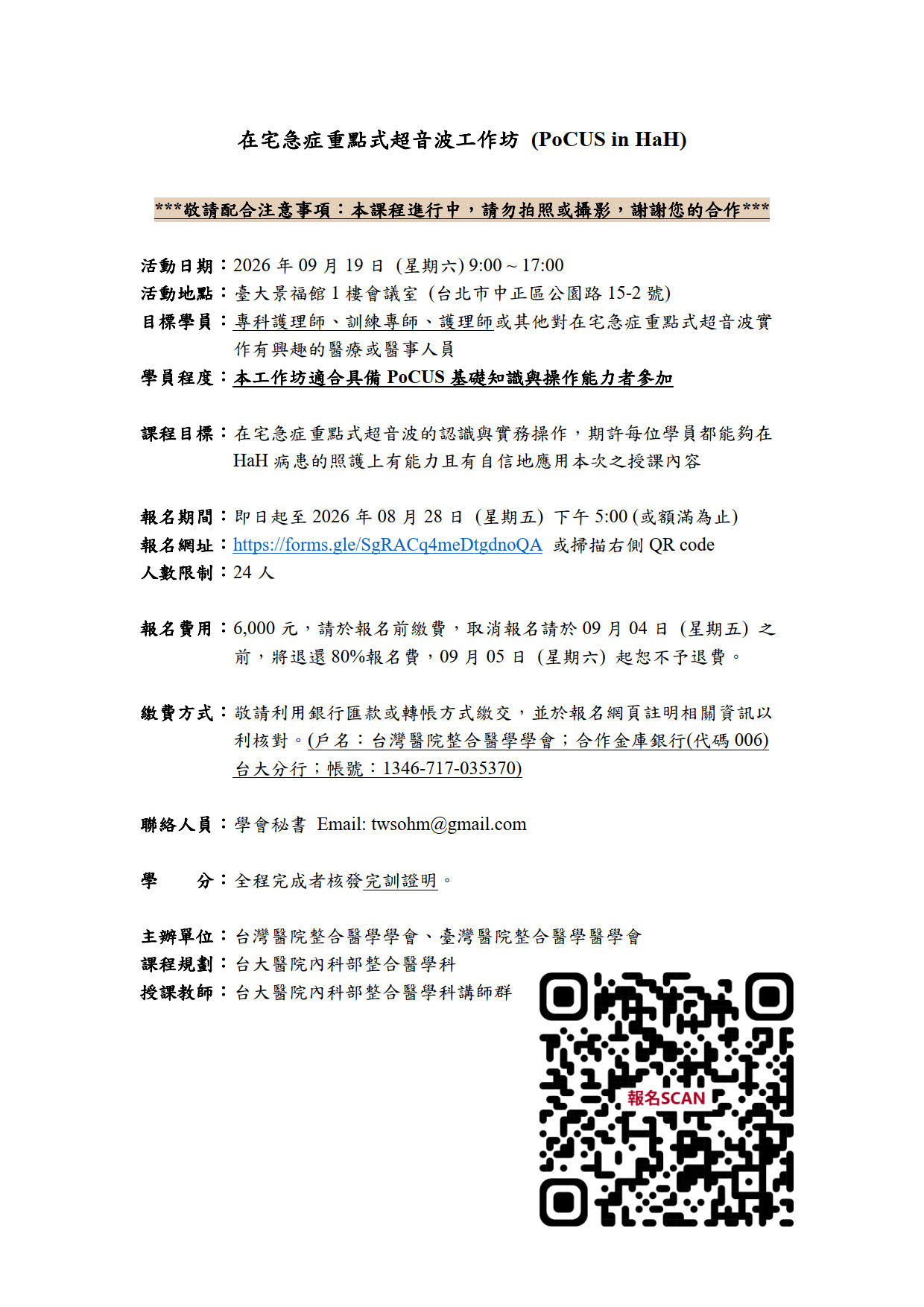 【報名與繳費】 報名連結:https://forms.gle/SgRACq4meDtgdnoQA 截止日期:即日起至(額滿提前截止) 繳費銀行:合作金庫 (006) 台大分行 帳號:1346-717-035370 戶名:台灣醫院整合醫學學會