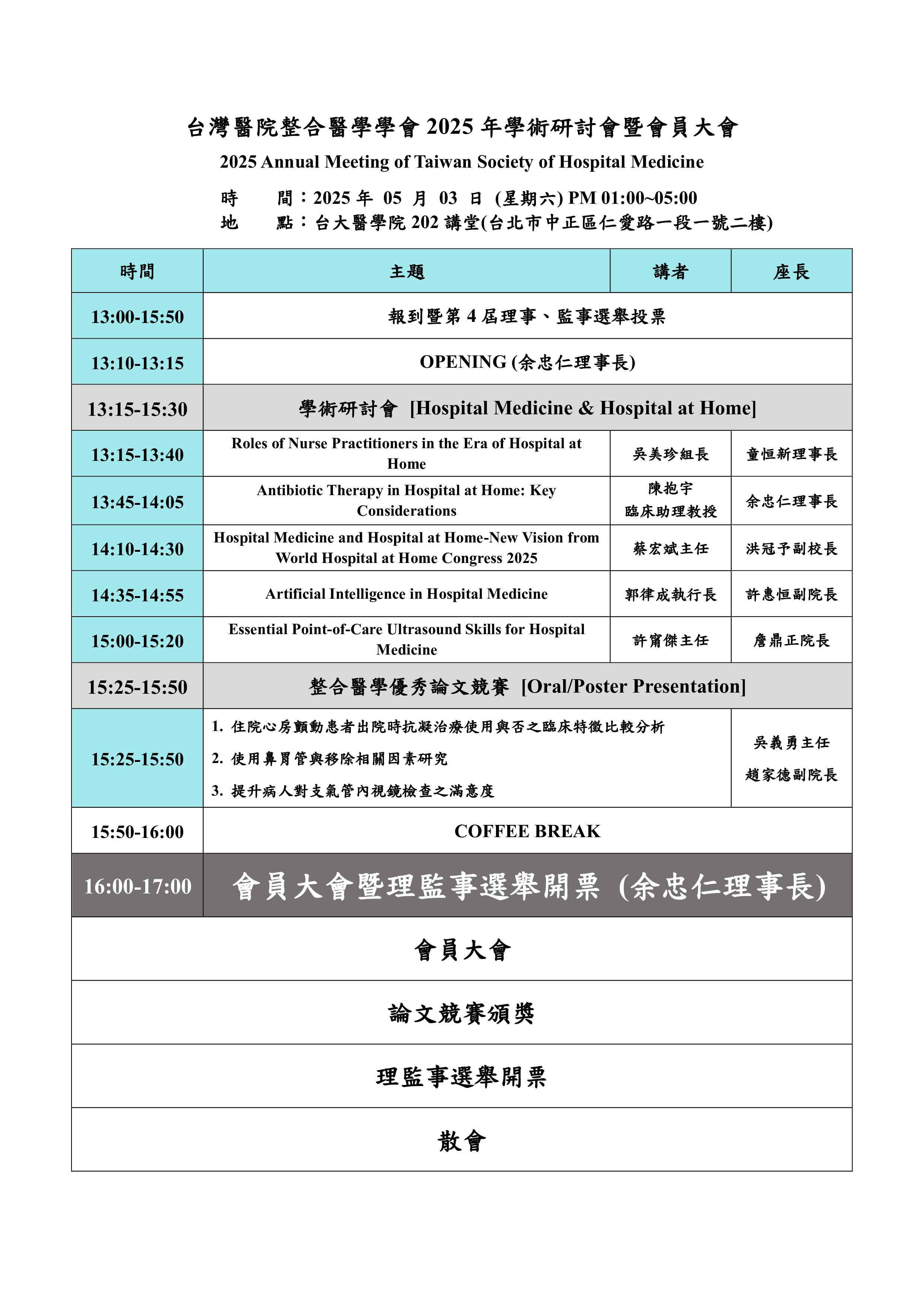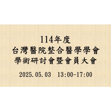 | 各位台灣醫院整合醫學學會會員您好: 本會114年度學術研討會暨會員大會資訊如下,誠摯邀請各位會員踴躍參與。 時 間:2025 年 05 月 03 日 (星期六) PM 13:00~17:00 地 點:台大醫學院 202 講堂(台北市中正區仁愛路一段一號二樓) 學 分: 護理師 專業課程 申請中
